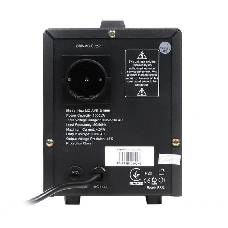 Особенности Симисторный стабилизатор напряжения, 1000 ВА Металлический корпус с индикатором напряжения Микропроцессорное управление Технология переключения в нулевой точке переменного напряжения Высокоэффективный тороидальный трансформатор Полная защита: от повышенного и пониженного напряжения, перегрева, короткого замыкания и перегрузки Характеристики Тип: однофазный, симисторный Входное напряжение: ~100-270 В, 50±10% Гц Выходное напряжение: ~230 В ± 4 % (до 8% в граничном диапазоне), синусоидальная форма Выходная мощность: 1000 ВА (600 Вт) Рабочие температуры: 0...+40°C Размеры: 210 x 140 x 118 мм Вес: 4 кг
